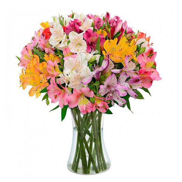 ste vibrante arranjo floral é um vaso de astromélias coloridas, também conhecidas como Lírios-peruanos. Elas são apreciadas por sua beleza delicada e longa durabilidade, sendo ideais para presentear em diversas ocasiões