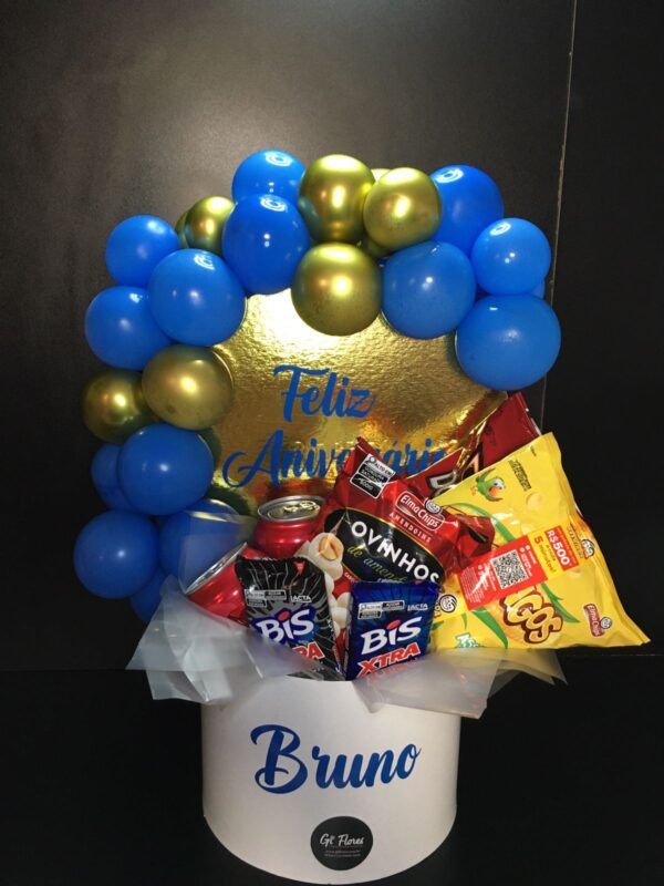 Box de Aniversário Masculino, uma opção de presente personalizada e festiva que combina aperitivos salgados, refrigerantes e chocolates, ideal para comemorar de forma prática e estilosa