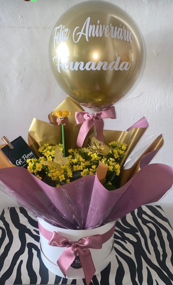- Balão Personalizado: Um balão do tipo bubble dourado com a inscrição personalizada “Feliz Aniversário “.