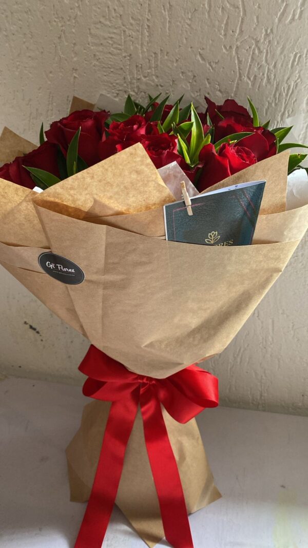O buquê parece ser composto por 12 rosas, um número tradicional que frequentemente simboliza uma declaração de afeto ou gratidão. As rosas estão dispostas de forma circular, com os caules à mostra na base, o que confere um aspecto rústico e sofisticado ao arranjo