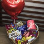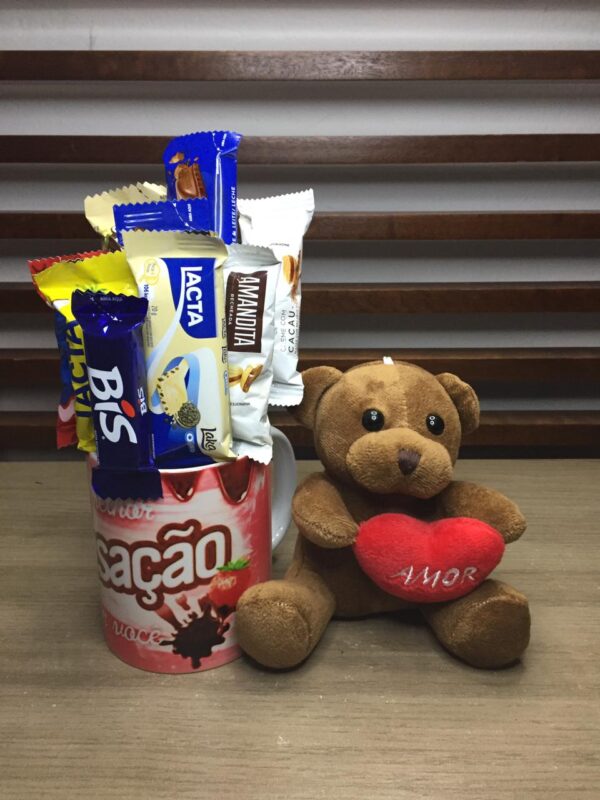 Kit de presente afetivo, composto por uma caneca temática repleta de chocolates populares e um pequeno urso de pelúcia com mensagem de amor.