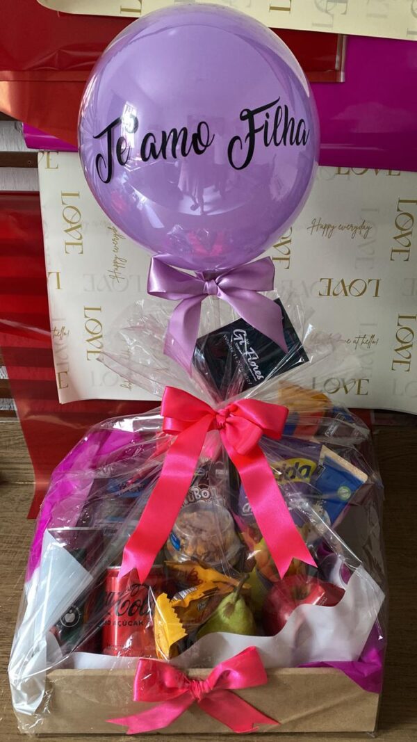 - Balão Personalizado: Um balão “Bubble” roxo com a frase “Personalizada” e um laço de cetim combinando.