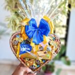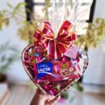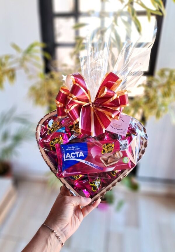 Cesta de chocolates em formato de coração, um presente romântico focado em produtos da marca Lacta, ideal para ocasiões como o Dia dos Namorados ou aniversários.