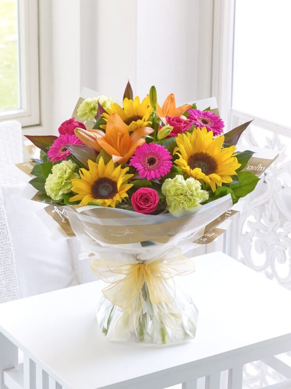 Este é um exuberante buquê misto de flores do campo, frequentemente chamado de arranjo “Energia” ou “Amanhecer”, devido à sua paleta de cores quentes e vibrantes. O conjunto é ideal para transmitir sentimentos de otimismo, alegria e sucesso.
