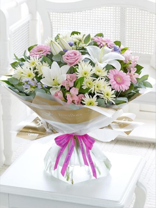 O buquê é montado no estilo “hand-tied” (amarrado à mão) e envolto em uma embalagem luxuosa de papel kraft ou celofane decorativo com detalhes dourados. O toque final é um laço de fita rosa vibrante, muitas vezes personalizado com a mensagem “Happy Birthday” (Feliz Aniversário)