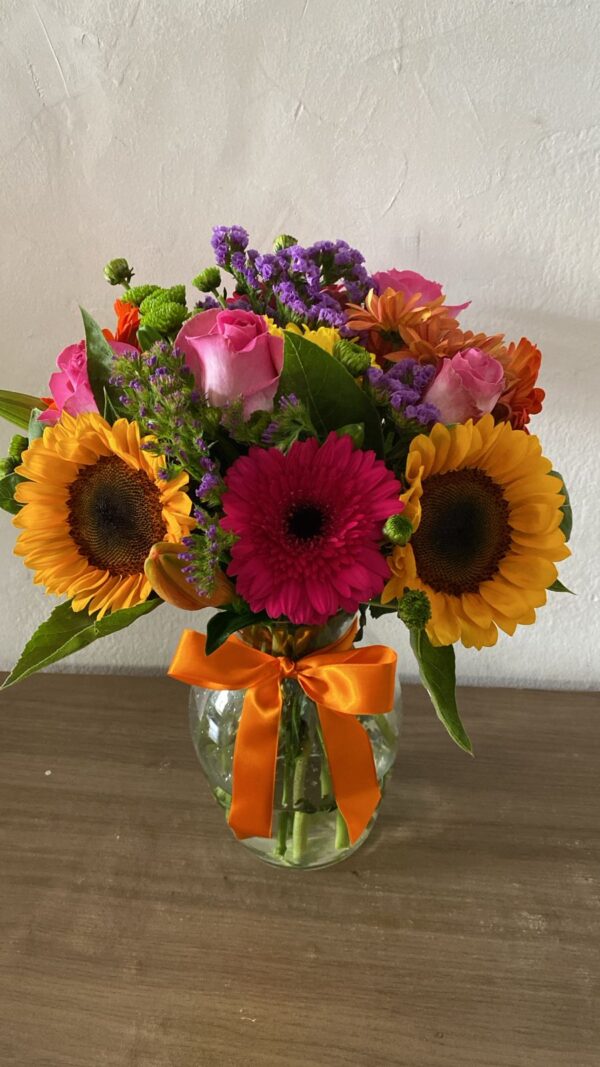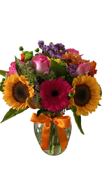 Este arranjo vibrante é uma composição mista que combina o brilho dos girassóis com a delicadeza de flores clássicas