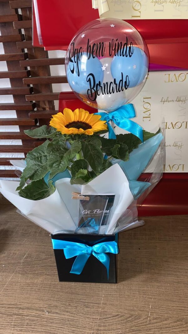 - Vaso de Girassol: Uma planta de girassol natural, símbolo de felicidade e boas energias, acomodada em uma embalagem decorativa